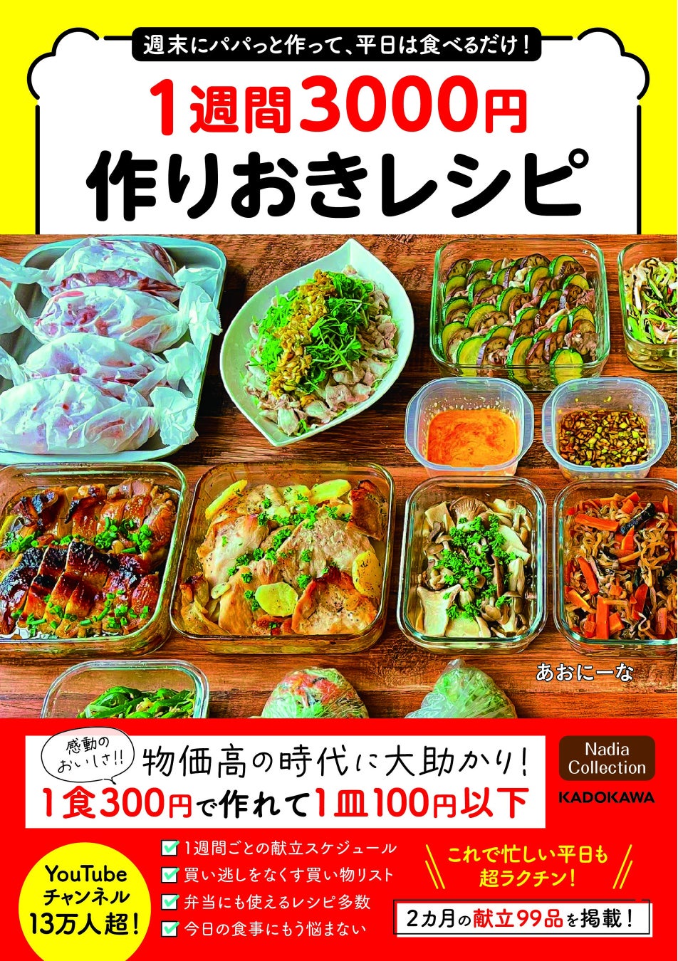 この本では2か月分の献立に相当する99品のレシピをご紹介しています。本にならって週末に作りおきをすれば、平日の献立はもう完璧。しかも、レシピは1人分約100円と、この物価高の時代に大助かりの超節約レシピになっています。また、1週間ごとに献立スケジュールや買い逃しをなくすための買い物リストもついていて、使いやすさも抜群です。