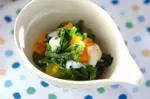 温泉卵がまるでソースのようにとろとろと、ほうれん草に絡みます。鉄分たっぷりなのでおすすめです。味付けはしょうゆだけ。温泉卵のコクを引き立たせて美味しく仕上がります。