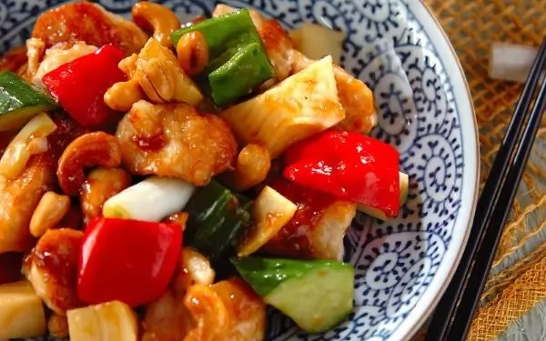 赤ピーマンやキュウリなどがカラフルな中華炒め。鶏むね肉は卵白をまとわせることで表面がコーティングされ、パサつきにくいですよ。たっぷりのナッツが香ばしく、大人も子どもも箸が進むこと間違いなしの主菜です。