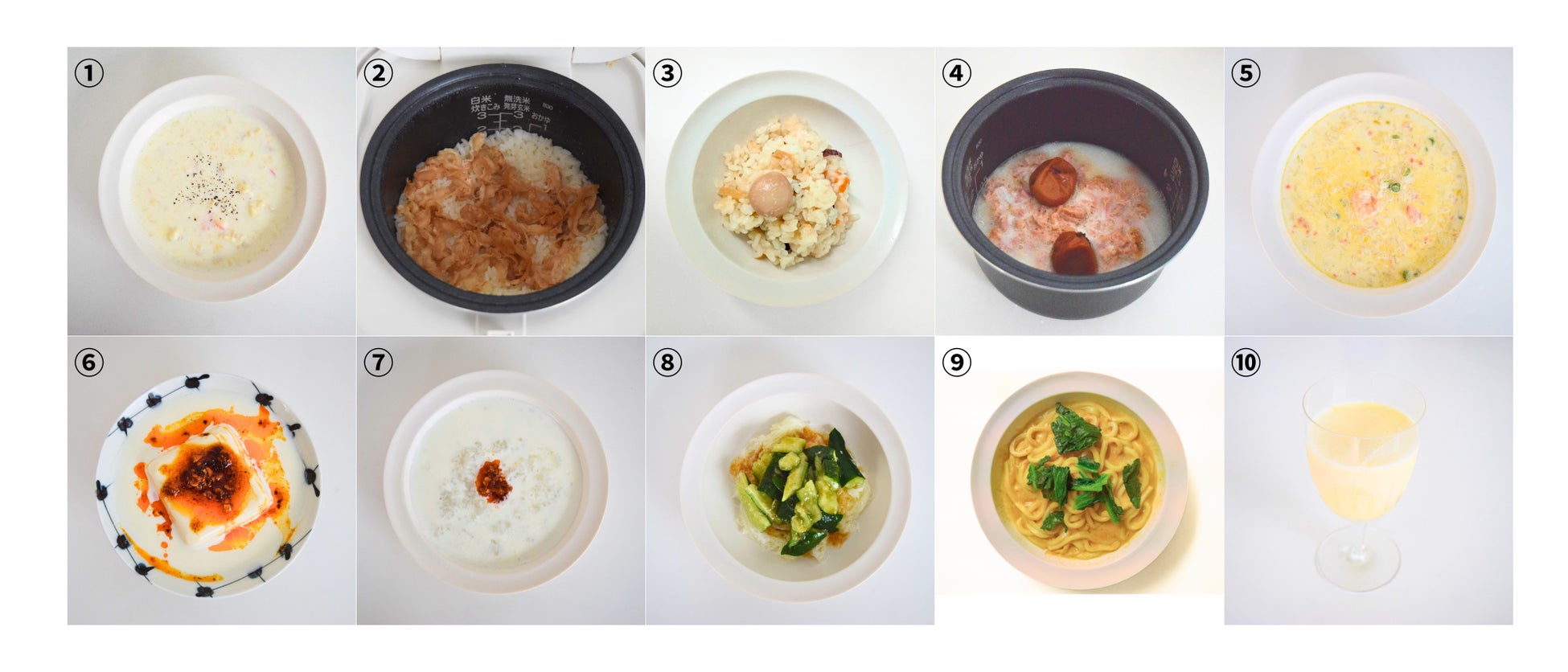 【つくり方】深皿にお粥、牛乳を加え、耐熱容器をかぶせ、電子レンジ(600w)3分加熱する。青のりをふる。