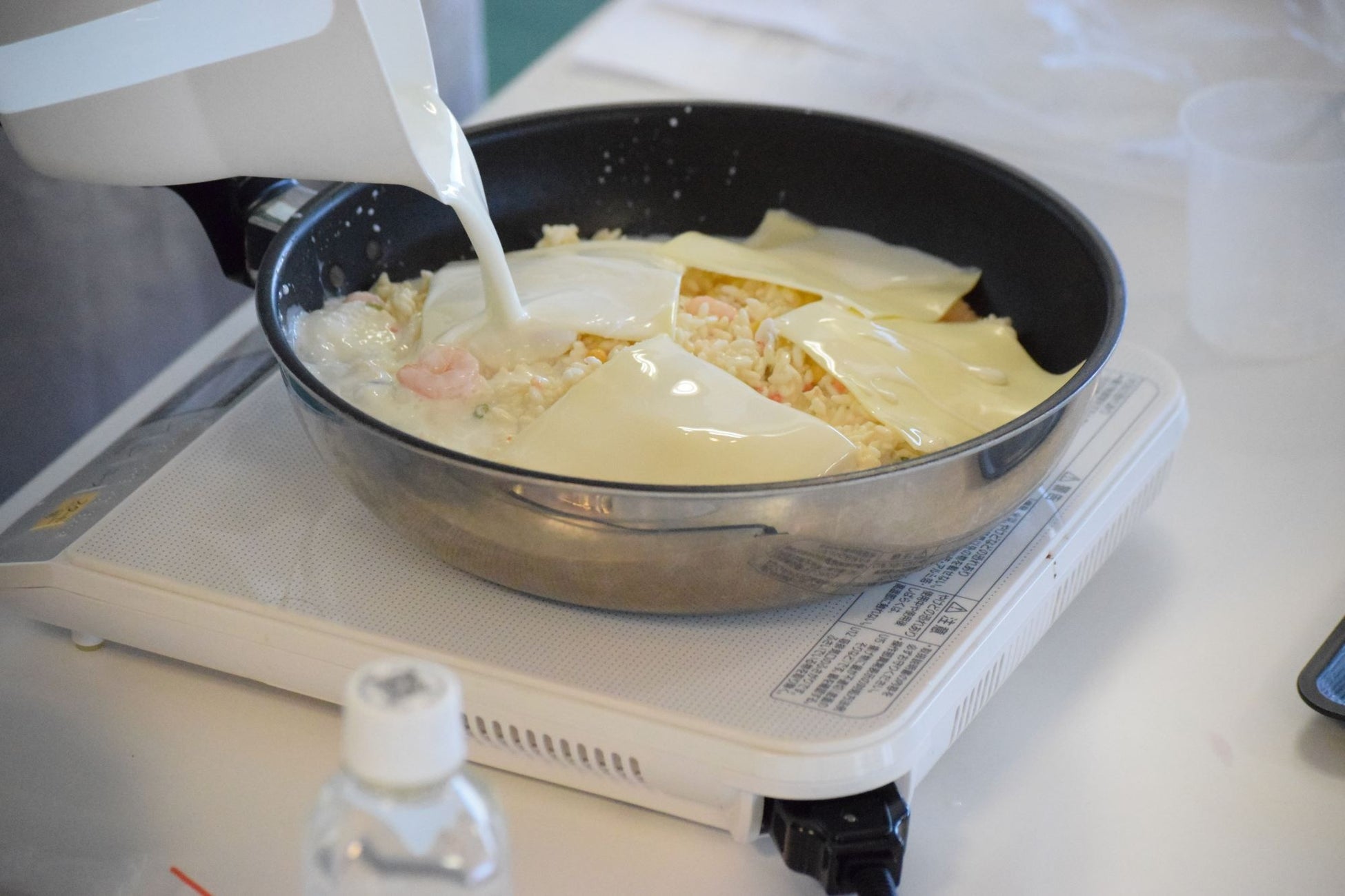 【材料】(1人分)●冷凍エビピラフ 1袋(180g)●スライスチーズ 1枚●牛乳150ml