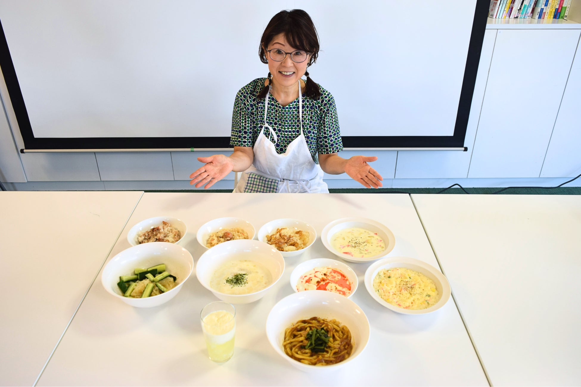 試食会では、調理器具の使用は最低限のものに留め、コンビニで販売されている身近な食材を用いて、ポテトサラダ・牛乳をレンジで加熱して完成する「ポテサラスープ」、豆腐と牛乳をレンジで加熱しラー油をかけて完成する「ラー油とろとろ豆腐」など10品を発表。「今、さまざまな種類の牛乳が店頭に並んでいますが、健康が気になる方はたんぱく質やカルシウムなどの栄養を強化した「次世代ミルク 」を選ぶこともおすすめです。中でも特に香料や味付けがされていない商品は色々な食材との相性が抜群で「ミル活」レシピの幅を広げることができます」と小山先生おすすめの牛乳を紹介。会場は「牛乳と食材の組み合わせが新しく、しかもおいしい!」「安くて簡単、さらに栄養たっぷりなのはうれしい!」などの歓声で包まれ大盛況となりました。